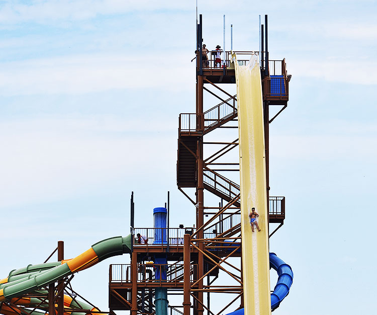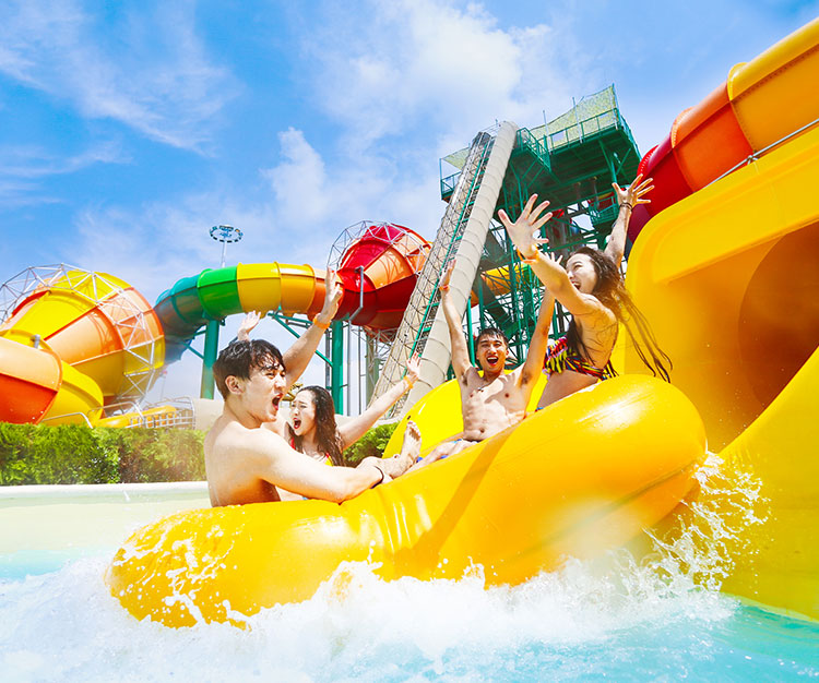4条延绵起伏的彩色滑道就如彩虹般延伸至水中,载你飞速穿越。想知道是谁先到达彩虹的另一端吗?想体验清水给你带来的竞赛感觉吗?那么邀上朋友一起,抱起飞毯向前冲吧。